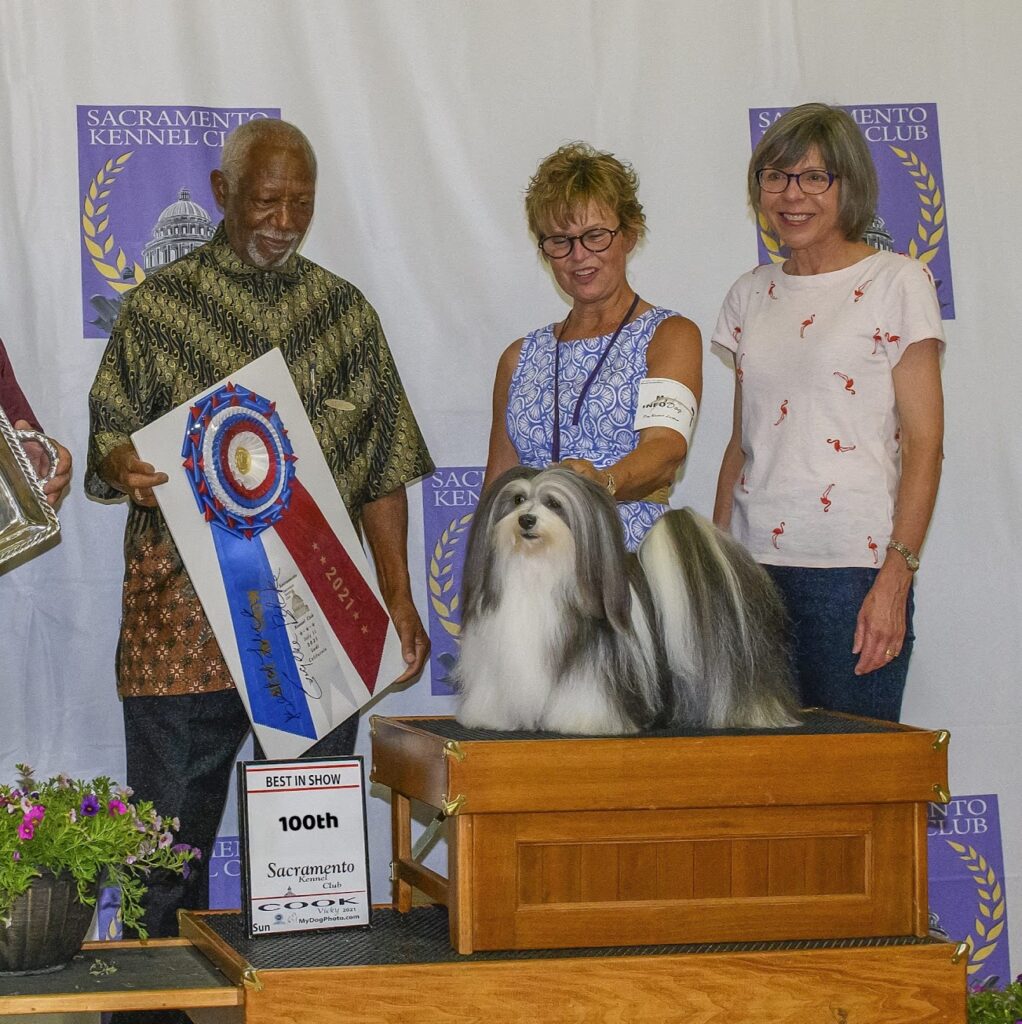 Bono’s 100th All Breed Best in Show. L-R Judge Eugene Blake, Taffe McFadden and Mary King. Photographer Warren Cook