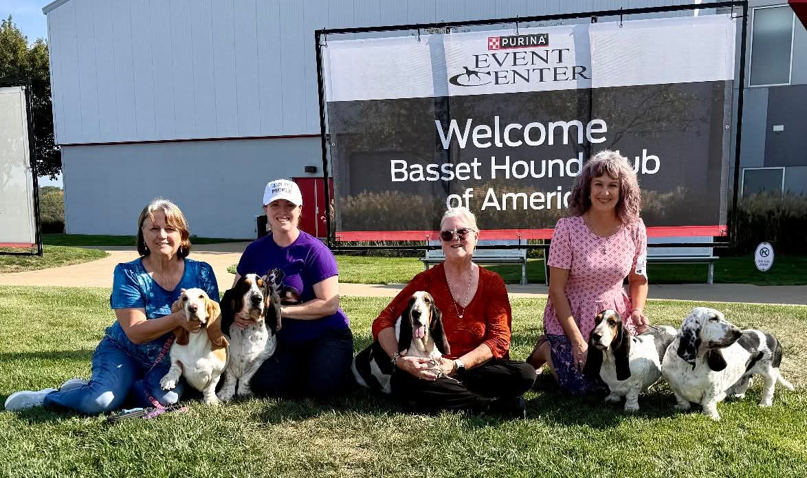 Rebel and her puppies at Basset Hound Nationals in 2025; L-R – CH Bluefence Smooth like Butter w/ owner Cindy Patrick; DC Bluefence Warden of the North, RN w/ owner Dr. Alyssa Shelby; GCH Bluefence Castlehill Crossroads Rebel Just 4 Kicks, ROM, CGC, RN w/ owner Sara Watson; GCH FC DC Bluefence Crossroads The Yodeling Cowgirl RE, HH, VCX and FC Bluefence Army of Me, RN w/ owner Vicki LePenske.