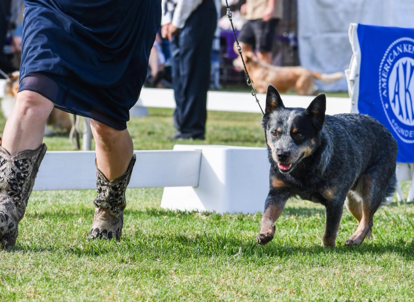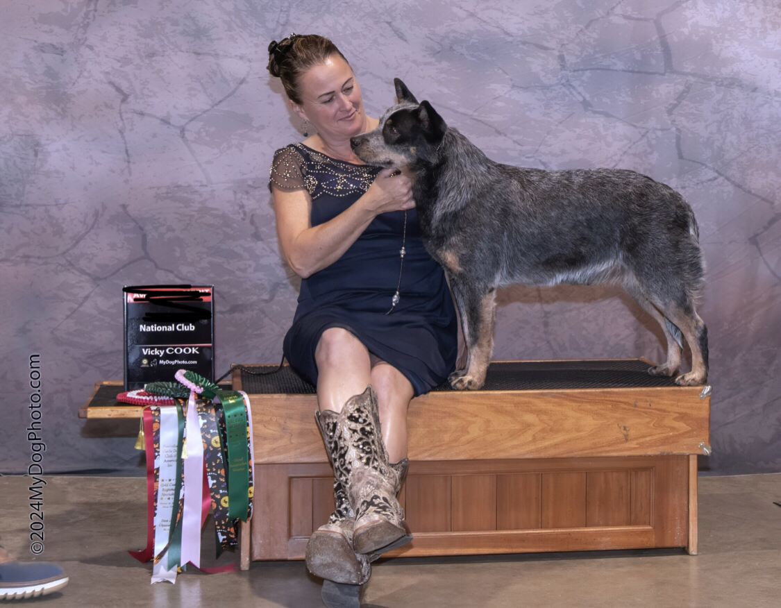Grand Champion Bronze BOSS BSV AOM’s Int/National CH Rocking P’s Shooting Blue Star Sapphire Wishes Come True, a.k.a. “Star,” has always been a special dog at Rocking P Ranch. Star loves to be with her owner and breeder, Misty Pursell, no matter what she is doing. Star LOVES to show & has always been in the ribbons when she steps in the show ring. Controlled high energy, very sweet and always wants to please temperament! Star is a wonderful mom who loves her puppies & is also an amazing grand dam. Kokopelli has managed all of Star’s reproduction from progesterone testing to TCI’s to pregnancy ultrasounds to delivery (three planned c-sections). As of 2025, Star has produced 1 Grand Ch Bronze & 2024 CA #1 AKC Conformation Bitch, 6 USA CH, 1 MX CH, 1 ACD Specialty Best Puppy In Show with quite a few more working their way to Championship titles currently. She also has pups that are certified and ranking in agility, herding, scent work, farm dog, rally and flyball. A couple of her pups are also diabetic alert dogs. Along with her gorgeous movement and balanced temperament, Star is a beautiful example of the AKC ACD standard for conformation. Star is the foundation bitch at Rocking P Ranch.
