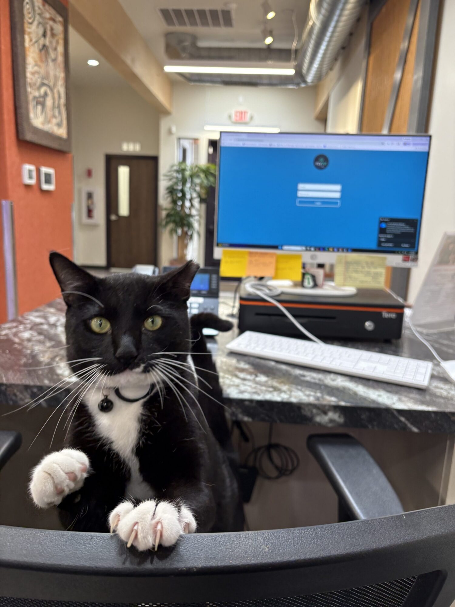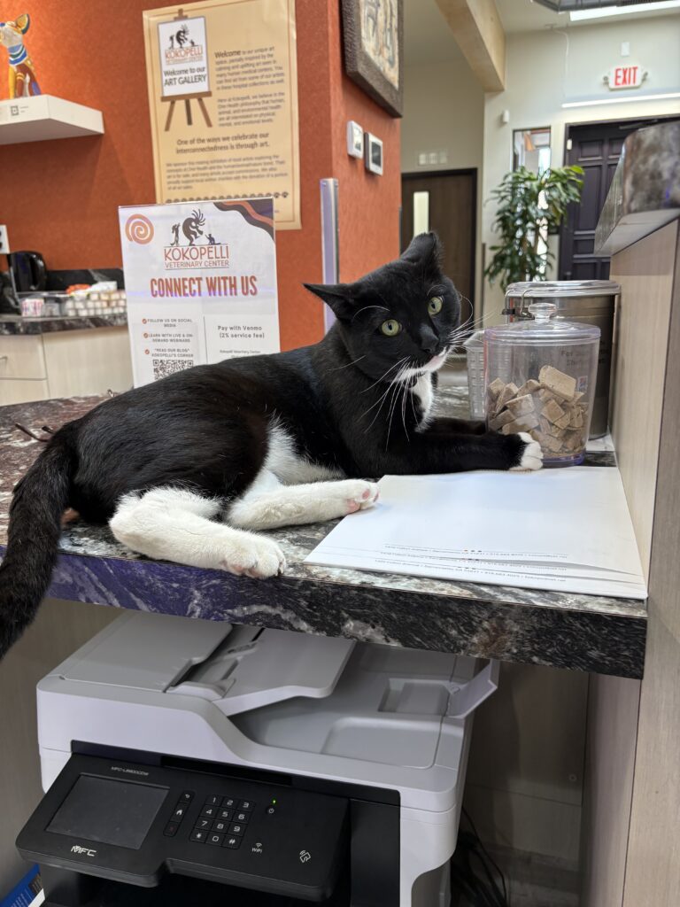 Mr. Squeaks was our parking lot feline who hired himself onto our CSR team. As part of his hiring package, Dr. Shelby removed his testicles and the tip of one ear. Despite this initiation, Mr. Squeaks decided to stay on as a customer service ambassador. He is only passably good at his job and still learning to interpret social cues. He will meow and rub up against strangers, then become overwhelmed with passion and give an unexpected love bite. So, for now, he spends most of his time still in training behind the scenes.